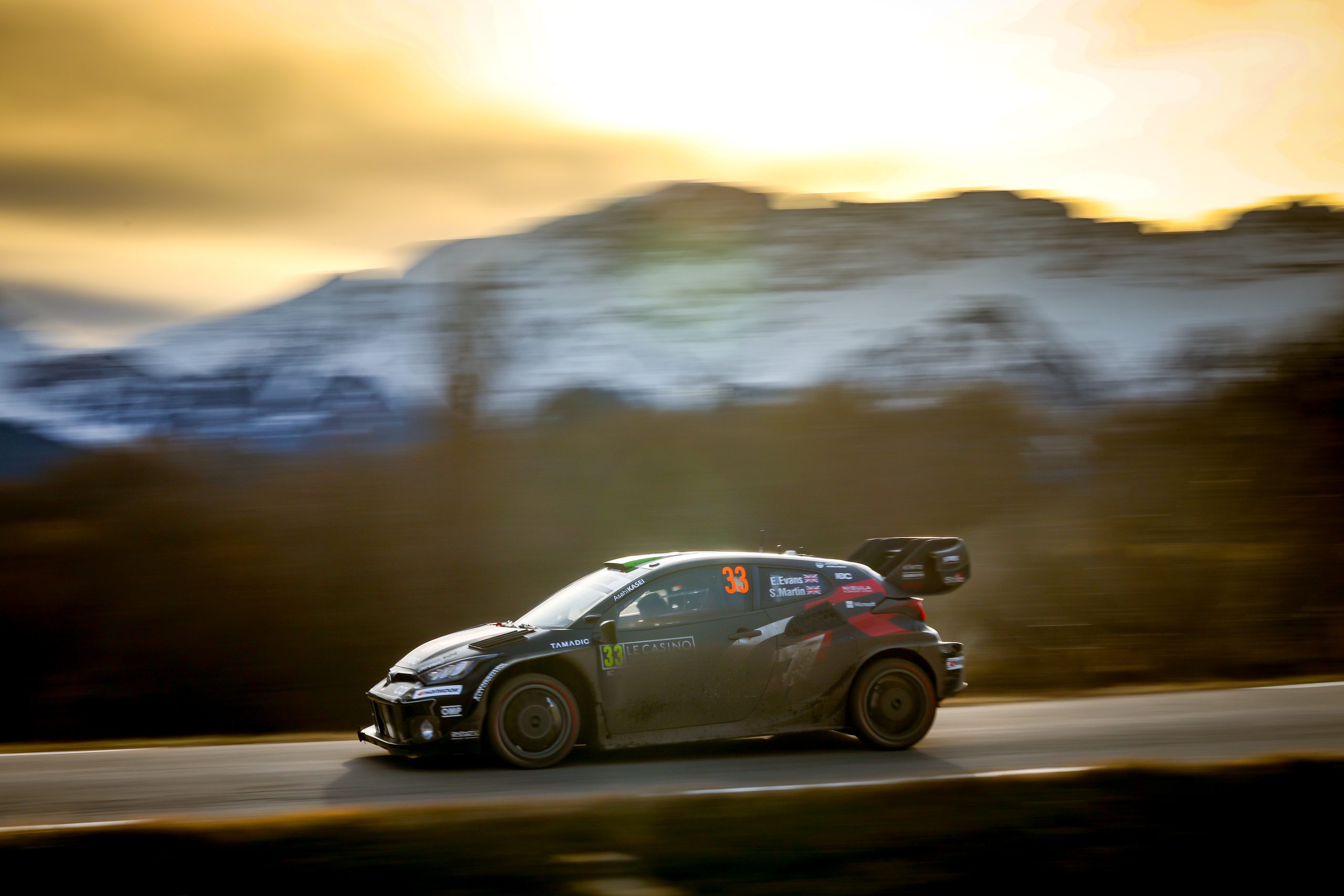 In front of tens of thousands of spectators in the night-time opening stages, Ogier, on a charge for that magical tenth Monte win, won the first two of Day One’s three speed tests to lead by 5.3 seconds over defending World Champions Thierry Neuville/Martijn Wydaeghe (Hyundai Shell Mobis WRT) and Evans 12.7 seconds off the lead.